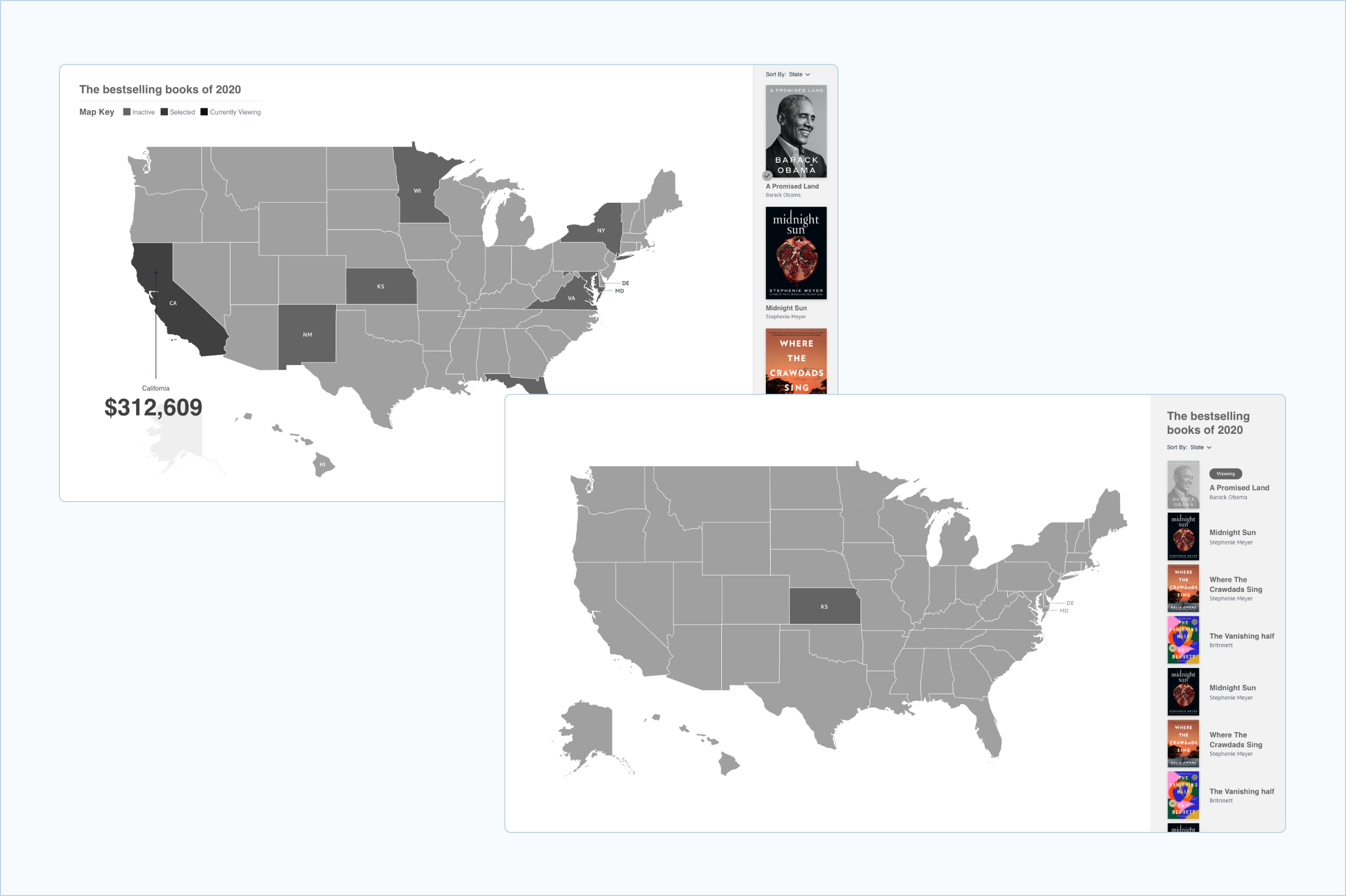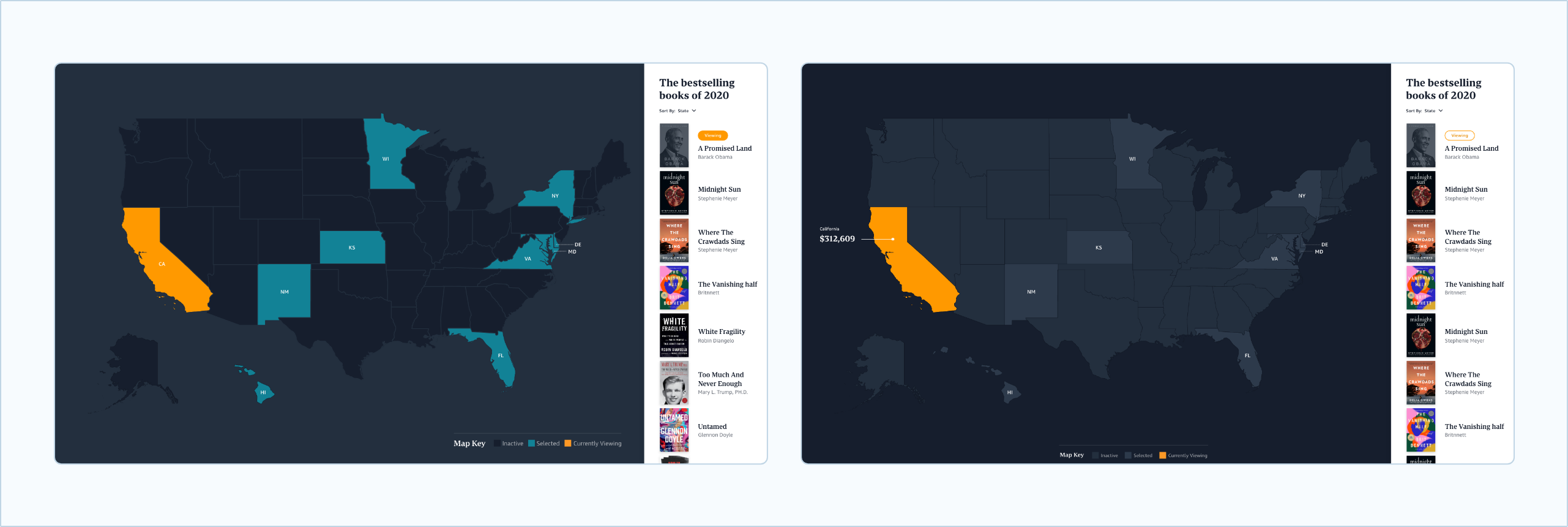 The need was to create an interactive map that showed the most popular books of each state for the year 2020. The goal is not only show where the reader can find their next favorite read, but also give them insight into what books are most popular amongst their peers and with that to hopefully drive more engagement.